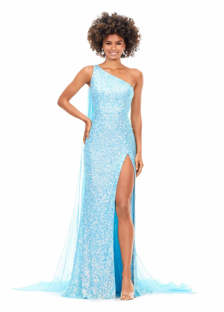 Dazzle in this sequin one shoulder dress complete with a detachable chiffon cape. Offered in many vibrant color options, you're sure to be shining!