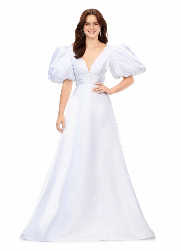 This elegant a-line gown features a heat set detailed waistband and oversized puff sleeves. With a v-neckline and v-back, this gown is the perfect mesh of elegant and fun!